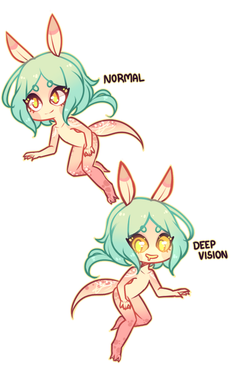 Once they reach a certain depth or at their own choice an Illumi is able to use bioluminescents in their eyes as actual flashlights, illuminating previously pitch black areas.